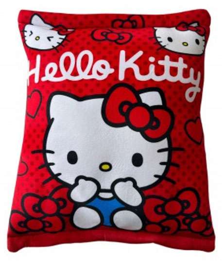 Cuscino peluche dedicato a Hello Kitty. Al suo interno vi sono 6 mini peluche raffiguranti Hello Kitty con vari stati d’animo.