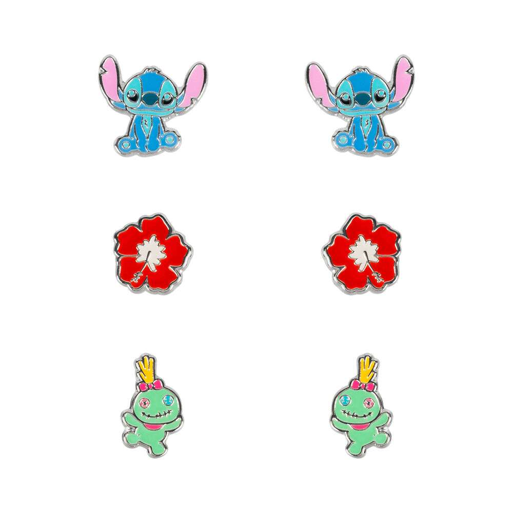 Placcato argento. Con un paio di orecchini a fiore rosso, Stitch stesso e l’orso Scrump di Stitch.
