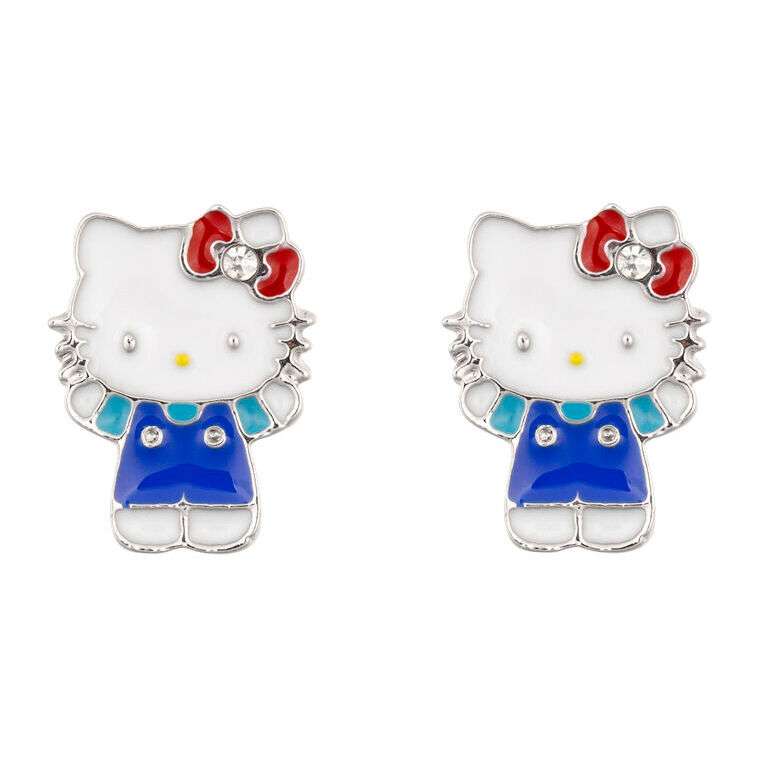 Placcato argento. Mostra il tuo amore per Hello Kitty con questi adorabili orecchini Hello Kitty in argento sterling. Questi orecchini presentano la silhouette ritagliata di Hello Kitty con il suo caratteristico fiocco rosa.