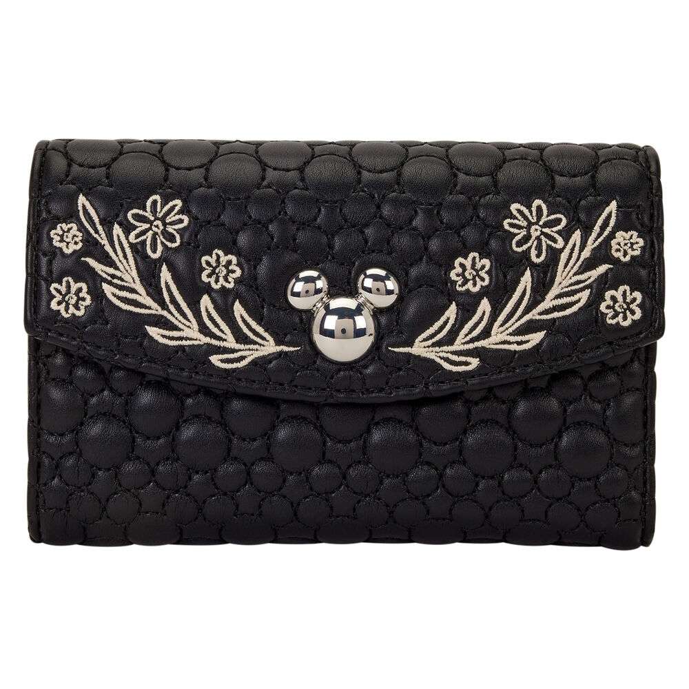 Dimensioni: 15,2 x 10 cm. Pelle sintetica (poliuretano). 7 slot per carte e 1 slot per ID trasparente. Applicazioni, ricami, trapuntature, decorazioni metalliche e dettagli stampati. Fodera interna in tinta.