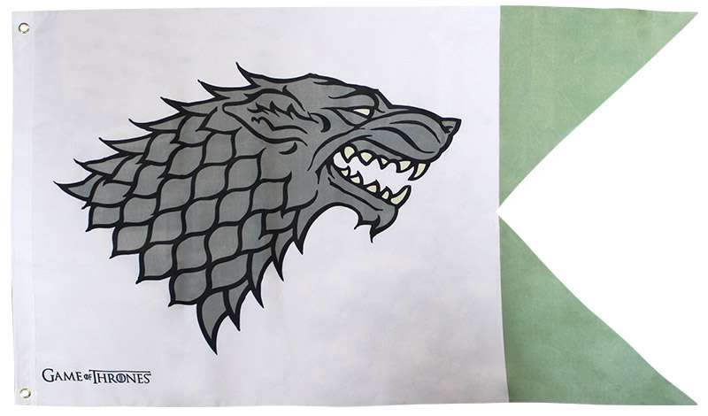 Bandiera con lo stemma della famiglia Stark della serie “Il Trono di Spade”. Dimensioni 120 x 70 cm. Stampa su entrambi i lati. Lavabile in lavatrice.
