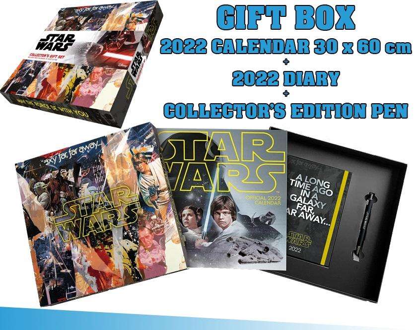 STAR WARS2022 GIFT BOX SETQuesto stupefacente e coloratissimo Gift Box Set comprende un iconico calendario (30×30 cm chiuso, 30 x60cm aperto), un’Agenda 2022 formato A5 ed una penna a sfera da collezione, il tutto racchiuso in una stupenda scatola riutilizzabile.Il regalo perfetto per ogni fan