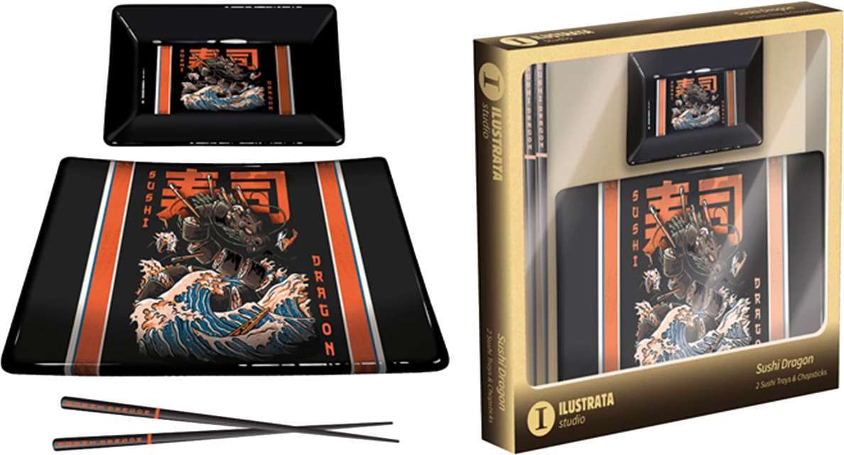 Goditi del gustoso sushi con questo meraviglioso set, composta da un grande piatto piano, una ciotolina per la salsa di soya e due bacchette in tinta. Piatto e ciotola sono realizzati in ceramica di colore nero e arricchiti dall’artwork del famoso Illustrata Studio con maestoso Sushi Dragon! Un divertente omaggio ai classici film di Kaiju. Attenti al Drago!