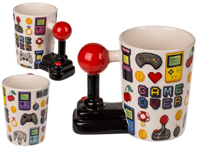 Tazza in ceramica con decorazioni a tema videogame e manico a forma di joystick. Misure 12 x 9 cm.