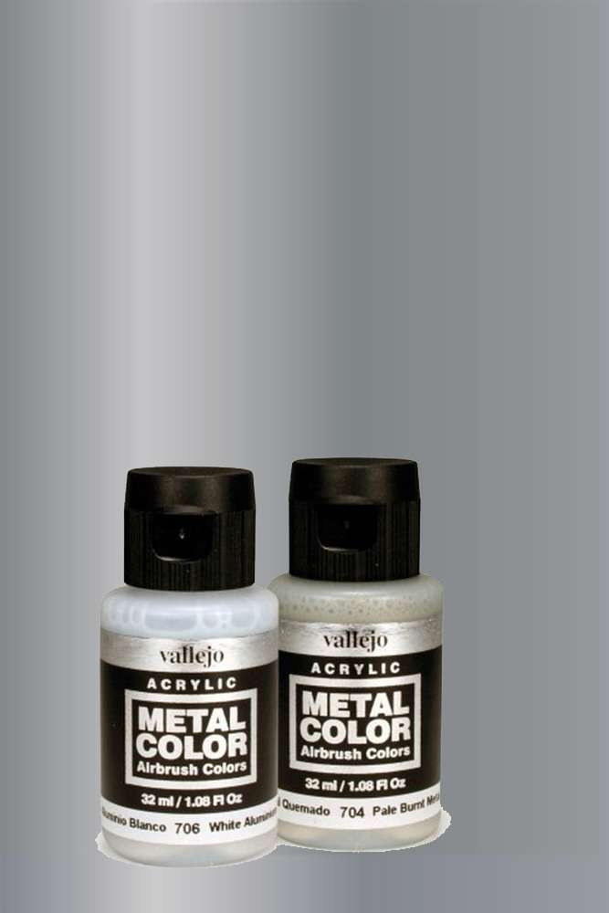 Metal Color e’ una nuova gamma di colori a base d’acqua, appositament progettati per l’aerografo. Nello sviluppo di questi nuovi e innovativi colori, sono stati utilizzati pigmenti idi alluminio di ultima generazione con una formula che produce una colorazione estremamente resistente ed aderente sia alla plastica che ai metalli. I Metal Color possono essere applicati direttamente sul modello senza uso di primer, tuttavia per modelli come fusoliere e componenti di aereoplani, raccomandiamo di applicare prima uno strato di glossy Black Primer per esaltare la incredibile qualita’ delle finiture in alluminio. I Metal Color vengono forniti in boccette da 32ml con tappo a scatto a e contagocce