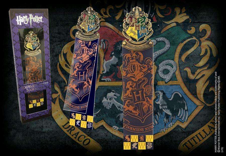 Segnalibro con testata, raffigurante il logo di Hogwarts con le 4 casate, in metallo pressofuso smaltato a mano.