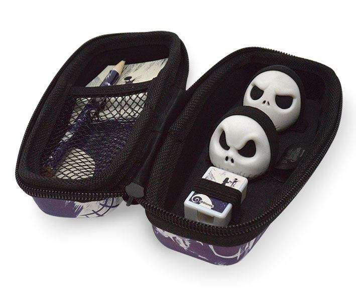 Mini cancelleria con licenza ufficiale che contiene una mini matita, un mini blocco note, due gomme 3D a forma di testa di Jack Skellington e un temperamatite.