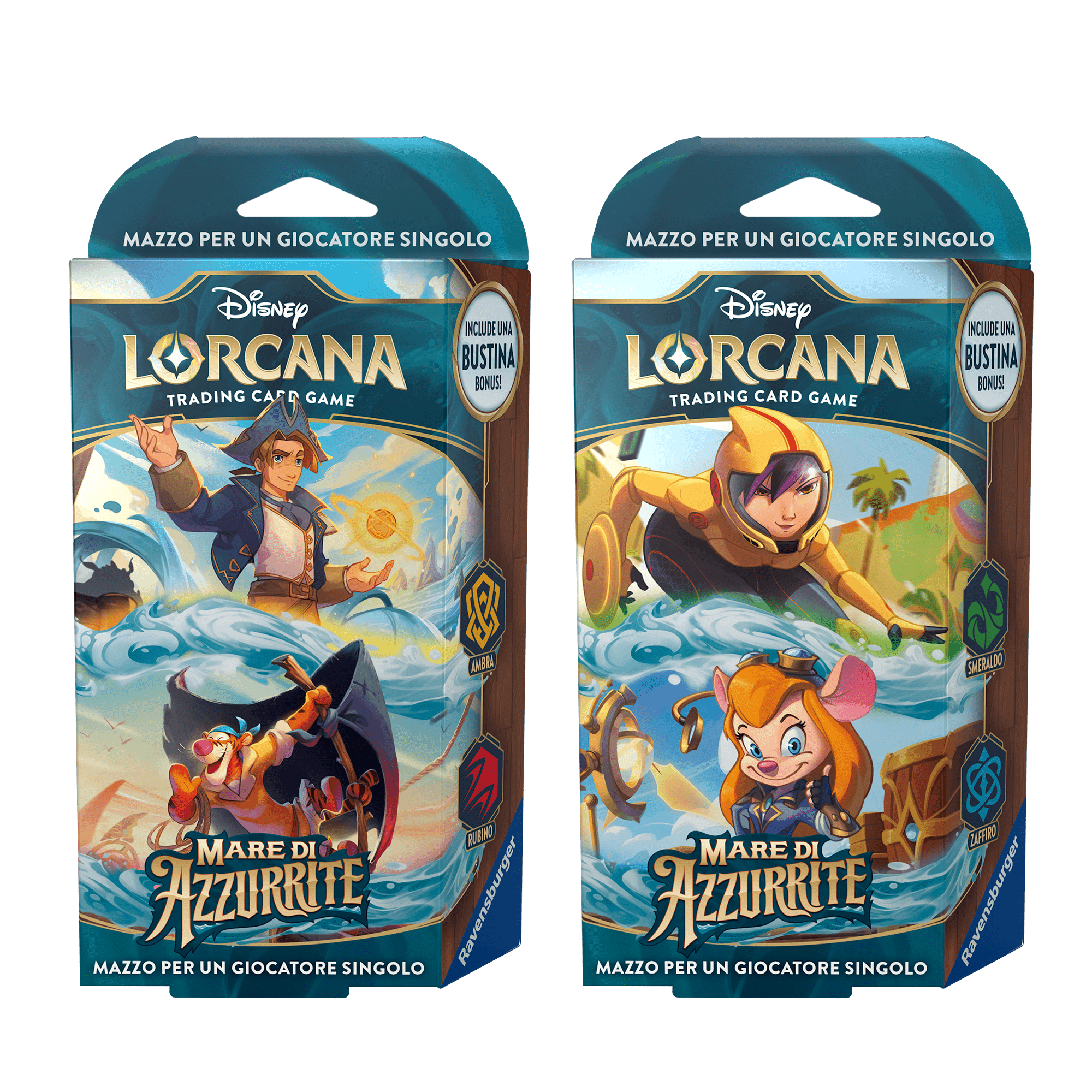 Sono disponibili due mazzi iniziali per il set Mare di Azzurirte di Disney Lorcana TCG. Ogni mazzo precostruito ha ha 60 carte e contiene carte di due tipi