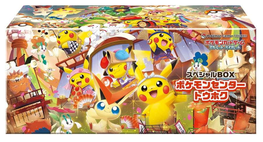 Il contenuto del Pokemon JPN Center Tohoku Special Box include una carta promozionale olografica di Pikachu di Tohoku 64 bustine protettive sleeves a tema un portamazzo rigido deck box e una scatola lunga long card box coordinata tutto decorato con illustrazioni esclusive che omaggiano la cultura locale.