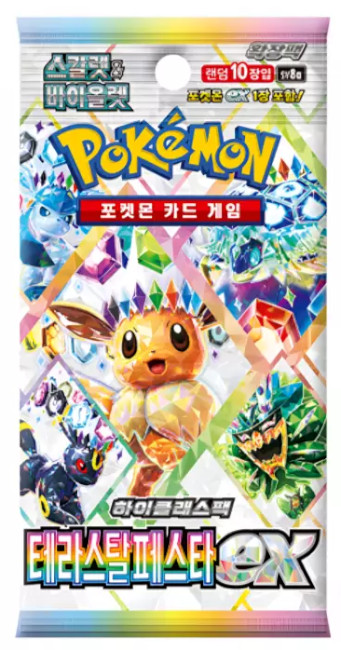 Terastal Festival ex in lingua coreana, espansione dedicata alle evoluzioni di Eevee! Ogni box contiene 10 bustine. Ogni bustina contiene 10 carte.