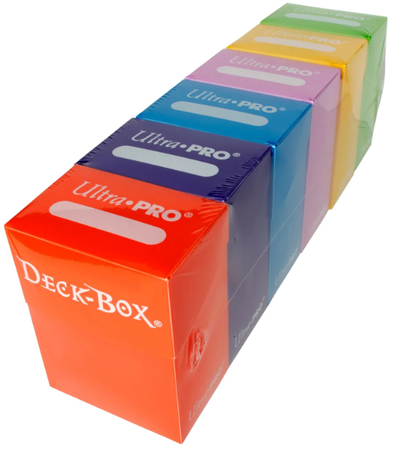 Pratico porta mazzo ULTRA PRO con sei colori assortiti. Perfetto per organizzare e trasportare i tuoi mazzi in modo ordinato e sicuro.