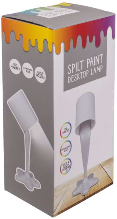 Lampada a forma di barattolo di vernice rovesciato, alimentata tramite USB (cavo incluso). La Lampada è alta circa 30cm.