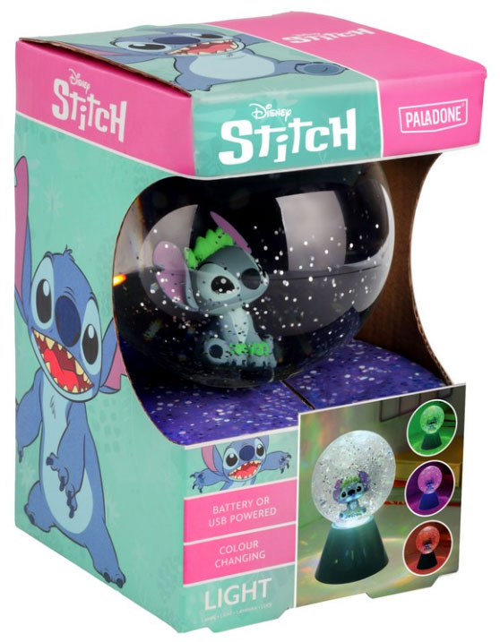 Lampada a sfera con glitter a tema Disney Stitch, di circa 11cm, alimentata tramite 3 batterie AA (non incluse).