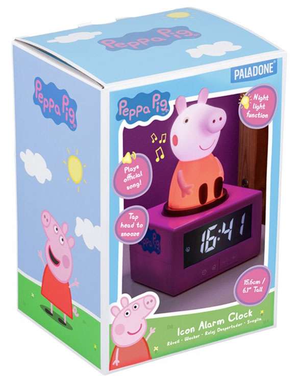Sveglia digitale alta 15,5cm, che presenta una statuetta di Peppa Pig su di essa. Riproduce la sigla ufficiale di Peppa Pig per aiutare il bambino a svegliarsi ogni giorno. Basta toccare la testa di Peppa per posticipare la sveglia e quando premi la testa verso il basso attiverai la funzione luce notturna, perfetta per aggiungere un po ‘di illuminazione delicata alla camera da letto del tuo bambino. Alimenta la tua sveglia con 3 batterie AA (non incluse).