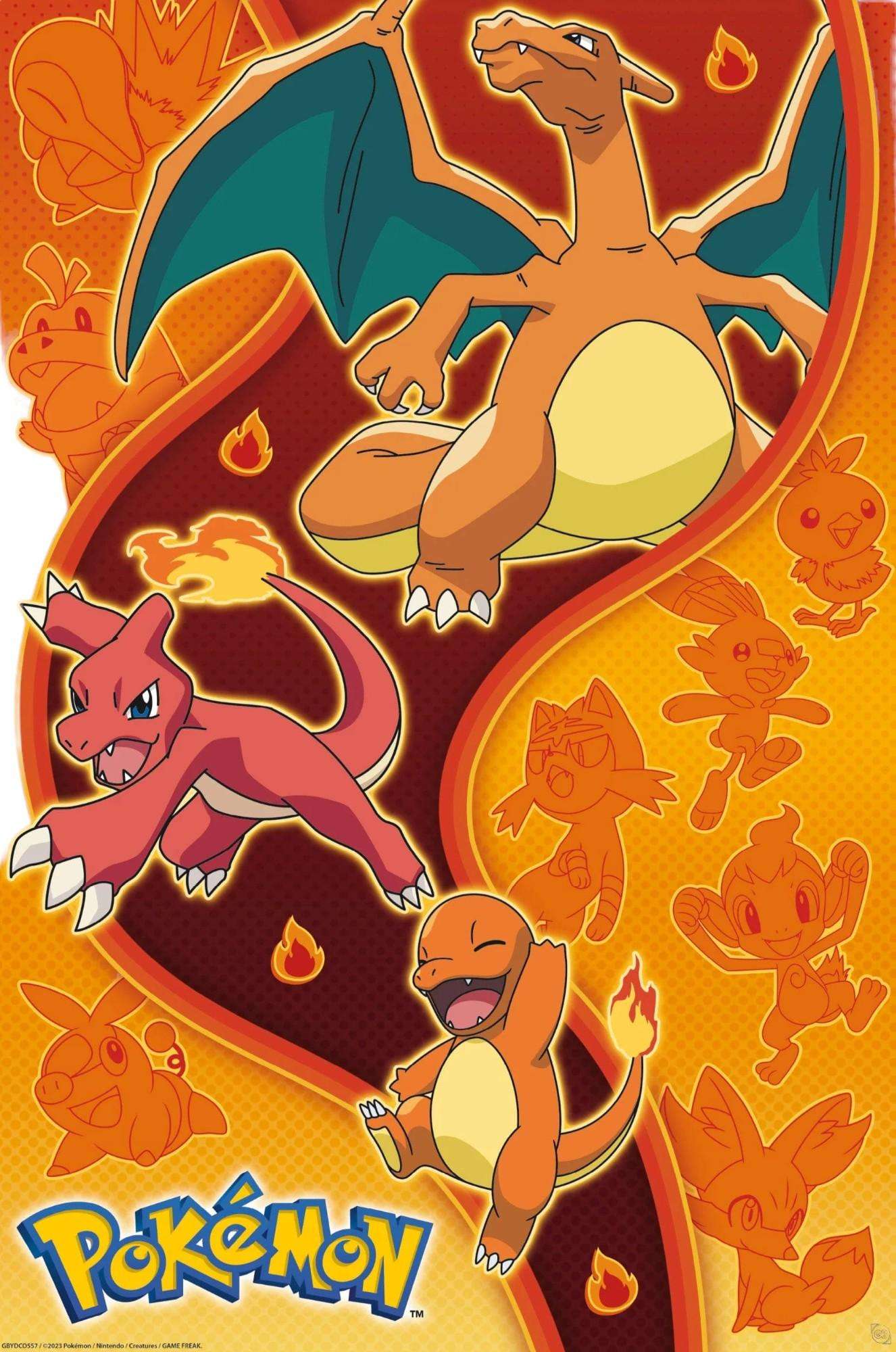 Questo poster Pokémon di tipo fuoco illumina la tua parete. Guarda l’evoluzione di Charmander in Reptincel e Charizard e molti altri Pokémon di fuoco su questo poster di GB eye.