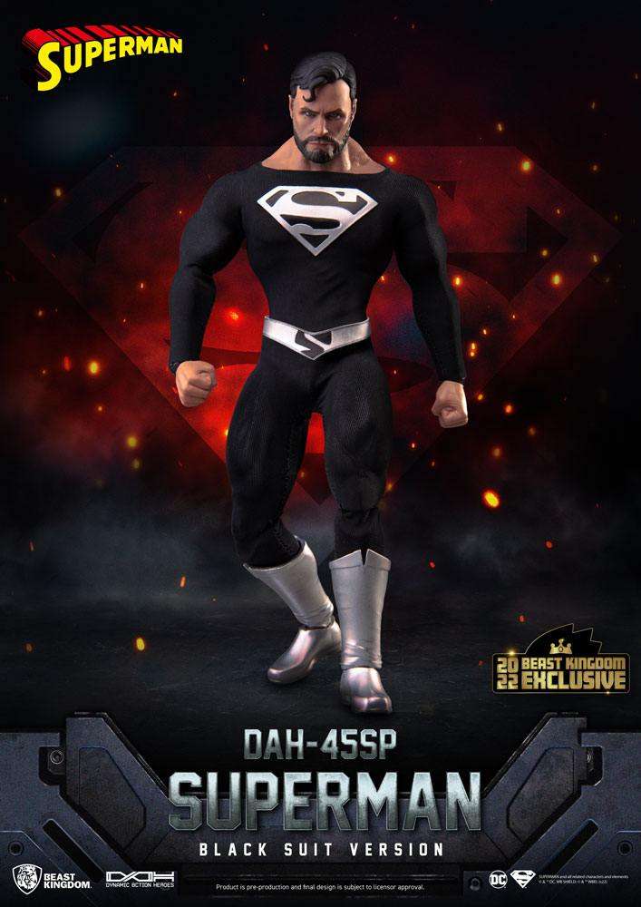 La collezione “Dynamic 8ction Heroes” di Beast Kingdom è tornata con il lancio di DAH-045SP DC Comics Heroes, Superman Black Edition”. Questa action figure da collezione in edizione limitata 1:9 dal vivo dà vita al famoso costume nero di Superman dei fumetti. Nella tuta attillata, realizzata in vero tessuto, Superman riesce a mostrare il suo fisico forte e la sua forza cruda con i suoi muscoli definiti.