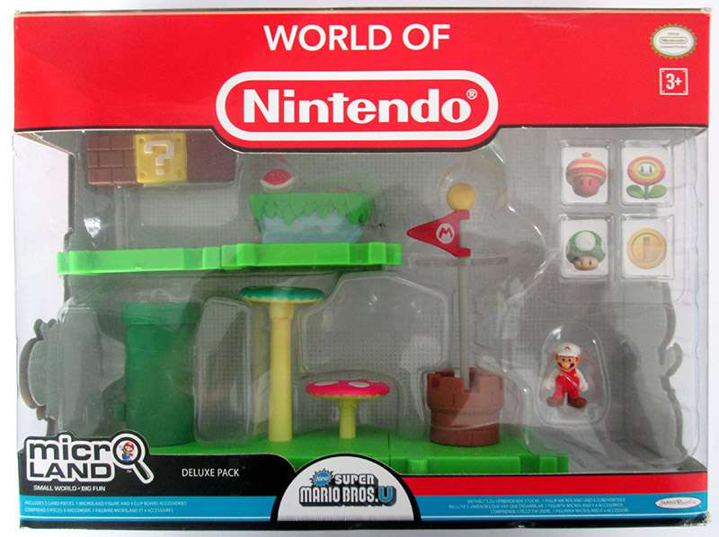 Playset con la micro figure di Fire Mario. I pezzi si uniscono gli uni agli altri. Uniscili per costruire il mondo di Super Mario U.