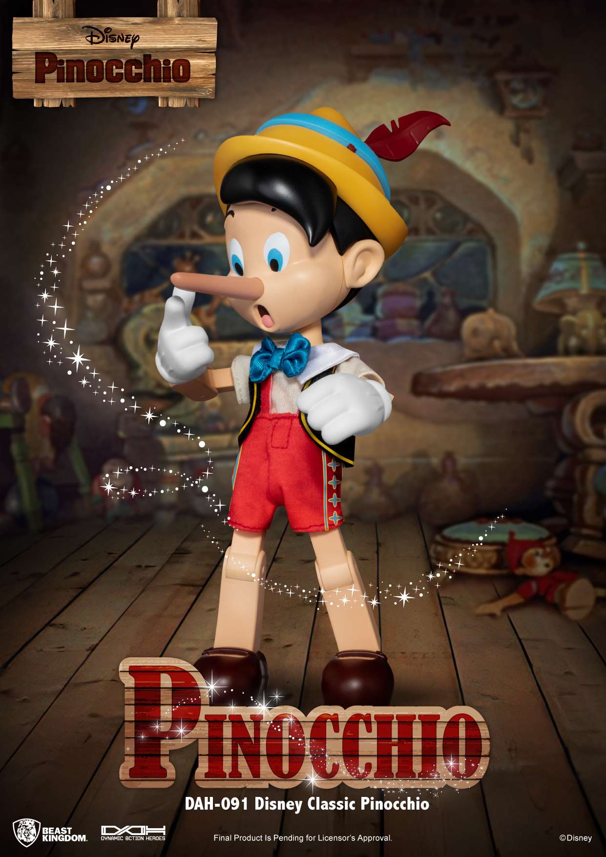 Nuovissima uscita per la linea di figure articolate DAH (Dynamic 8ction Heroes, creata da Beast Kingdom.Questa magnifica versione di Pinocchio, arriva con vestiti in stoffa, accessori e facce intercambiabili (con naso allungato o con orecchie da somaro)….nonchè l’immancabile Grillo paralante!