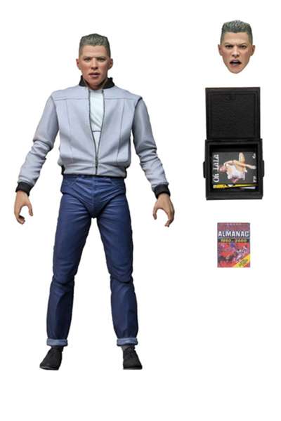 Direttamente dal primo, indimenticabile, “Ritorno al Futuro” ecco l’action figure in versione Ultimate di Biff! Il volto e gli indumenti in vera stoffa sono molto dettagliati. Inoltre nella scatola troverete diversi accessori: una testa intercambiabile, l’amanacco degli sport e una scatola.