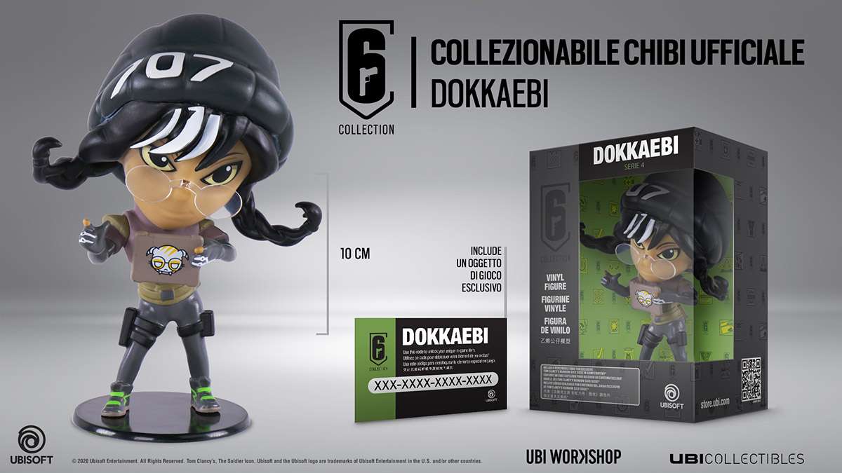 È giunto il momento di reclutare nuovi operatori nella tua squadra! Diamo il benvenuto a Dokkaebi, l’esperta di tecnologia. Dokkaebi fa parte della serie 4 dei Chibi della Six Collection, insieme a Finka, Blitz e Glaz. Ciascuna statuetta è accompagnata da un codice univoco che consente di sbloccare un ciondolo esclusivo in Rainbow Six Siege®.