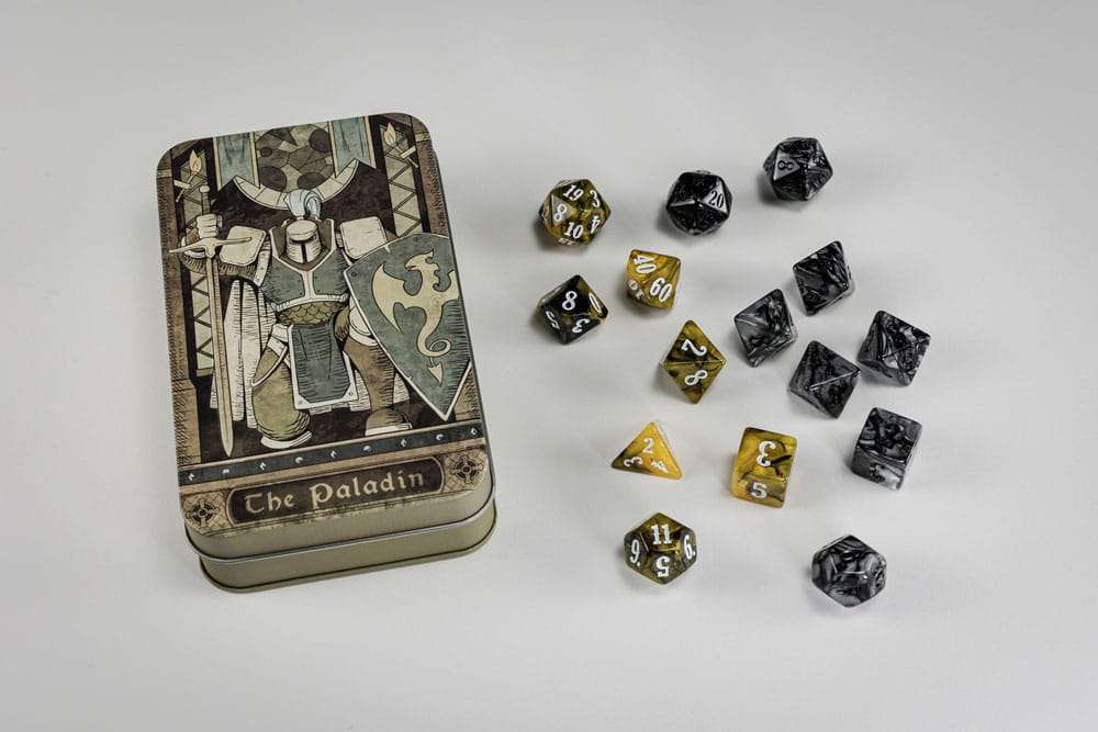 Class-specific RPG dice set for Paladins. 15 polyhedral dice in two color sets. Compatible with both 5e and Pathfinder rules.