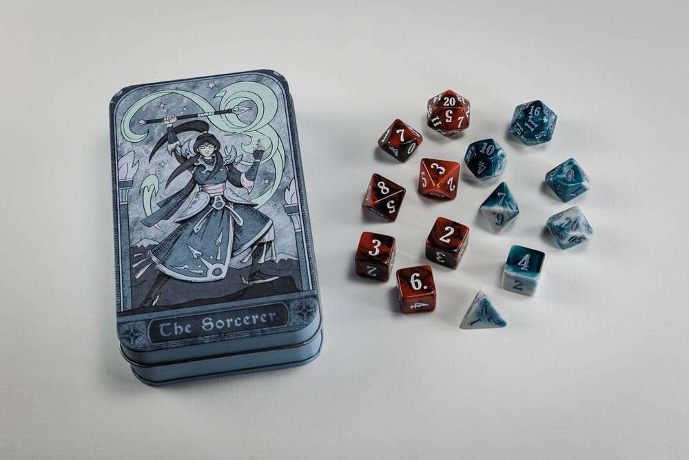 Class-specific RPG dice set for Sorcerers. 14 polyhedral dice in two color sets. Compatible with both 5e and Pathfinder rules.