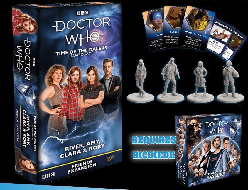 DOCTOR WHO TIME OF THE DALEKS 2nd EditionFRIENDS EXPANSION 1RIVER, AMY, CLARA & RORYCon questa espansione ora puoi aggiungere altri modi in cui i compagni del Dottore possono aiutarlo a sconfiggere i Dalek.Anche se devi essere cauto: Devros ha i suoi burattini e le sue spie ovunque, per cui il compagno che ti trovi di fianco potrebbe non sempre essere un aiuto.Questa espansione di gioco aggiunge 4 nuovi modelli di amici e il mazzo Friends a Doctor Who: Time of the Daleks, insieme alla nuova meccanica di gioco Amici.