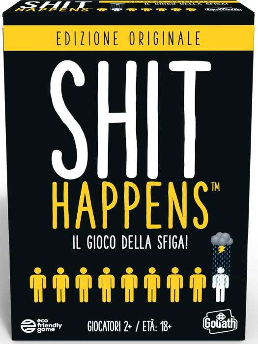 Shit Happens è il gioco della sfiga più amato del momento. Ideale per le serate di puro divertimento con gli amici. Si tratta di un gioco per adulti che si spinge al limite della probabilità. Durante il gioco potresti scoprire delle incredibili sfortune che possono essere capitate a te, a un tuo amico o che potrebbero capitare. Sei pronto a tutto? Come si gioca: Il gioco della sfiga è molto semplice non devi fare altro che collezionare le carte su situazioni di sfortuna davvero improbabili. Rifletti bene con ogni carta e classificala nel modo giusto sullo SHIT-O-METRO, una scala di sfighe appositamente studiata da un Team di esperti. Posiziona correttamente la carta per vincerla! Quando raggiungi 10 carte hai vinto! La confezione contiene: