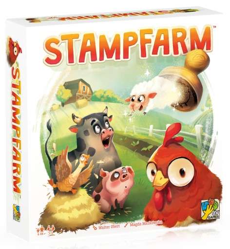 Stampfarm è un gioco da tavolo strategico semplice della durata di 20 minuti, le partite possono essere giocate da 2 a 5 giocatori dai 6 anni in su. Sally la contadina ti ha chiesto di aiutarla a costruire recinti per gli animali per tenere in ordine la sua fattoria. Sally vuole riunire gli animali in modo che ogni tipo abbia abbastanza spazio. Puoi aiutarla a sistemare gli animali in modo che siano tutti felici? Stampfarm è un gioco che include sei francobolli colorati che mostrano mucca, oca, gallina, maiale, pecora e balla di fieno. Al tuo turno, tira tutti e tre i dadi al centro del tavolo, poi scegli un dado e prendilo. Prendi il timbro dell’animale corrispondente e usalo per timbrare un quadrato vuoto a tua scelta sulla tua scheda della fattoria. Ora il giocatore successivo, procedendo in senso orario, sceglie uno dei due dadi rimasti al centro del tavolo, senza prenderlo, poi usa il timbro corrispondente, e così via, finchà© tutti non hanno impresso un animale nella propria fattoria. La faccia del dado che mostra la balla di fieno è un jolly se scegli un dado raffigurante la balla di fieno, puoi utilizzare qualsiasi timbro. Dopo che tutti i giocatori hanno riempito tutte le caselle delle loro fattorie, il gioco finisce. Per ogni tipo di animale che hai nella tua fattoria, conta il gruppo più numeroso. Per ogni animale nel tuo gruppo più numeroso totalizzi un punto. La modalità avanzata aggiunge il timbro della balla di fieno, le siepi sul tabellone e tre carte di richiesta casuali con nuovi modi per guadagnare punti.