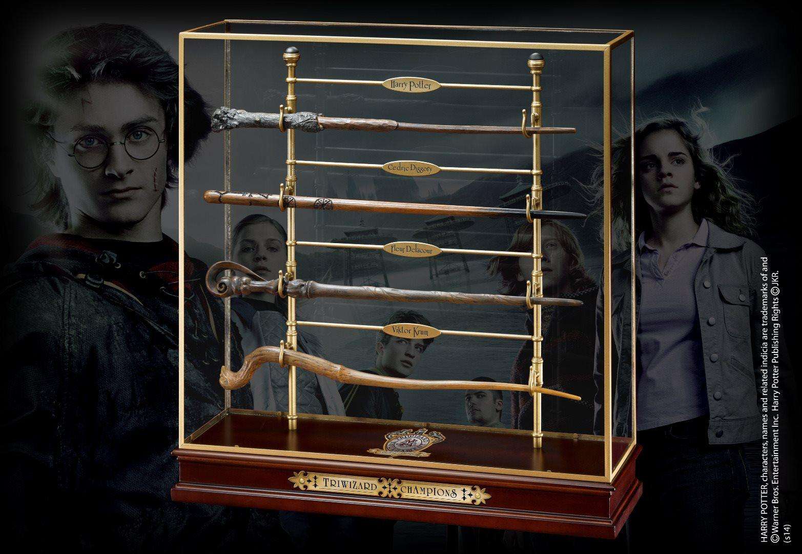 Le bacchette dei quattro campioni del Torneo Tremaghi: Harry Potter, Cedric Diggory, Viktor Krum e Fleur Delacour, riprodotte fedelmente e presentate in un elegante espositore.