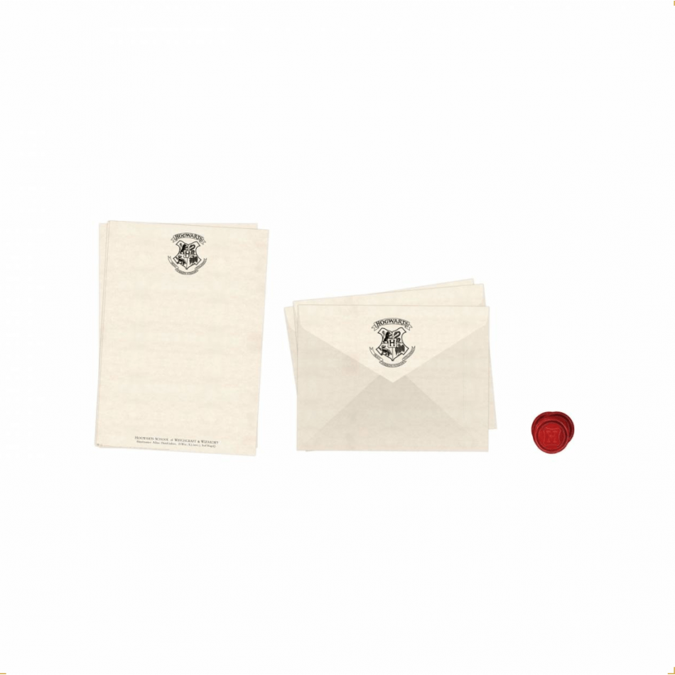 Replica autentica della lettera di accettazione di Hogwarts e di un intero set di lettere. Contiene 10 fogli di carta da lettere di Hogwarts, 10 buste di Hogwarts e 10 adesivi con sigilli di Hogwarts.