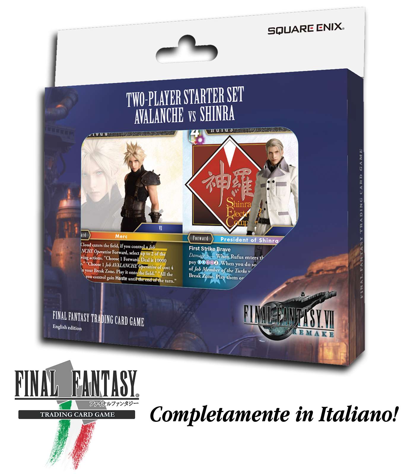 Siamo lieti di presentare l’ultima aggiunta alla line-up TWO-PLAYER STARTER SET, con FINAL FANTASY VII REMAKE.Nel set sono inclusi due mazzi precostruiti: il mazzo AVALANCHE, una build Fuoco/Terra incentrata sui membri dell’organizzazione AVALANCHE che cercano di salvare il pianeta e il mazzo SHINRA, una combinazione Ghiaccio/Fulmine con figure oscure della ShinraElectric Power Company che ostacolano Cloud Strife e i suoi alleati.Con questo set, sei già pronto ad affrontare i personaggi di FINAL FANTASY VII REMAKE!Square Enix ha sviluppato diversi giochi di carte da collezione che celebrano i suoi franchise più iconici.Uno dei più noti è il Final Fantasy Trading Card Game (FFTCG), lanciato a livello globale nell’ottobre 2016, un gioco di carte collezionabili che permette ai giocatori di costruire mazzi utilizzando personaggi, evocazioni e scenari tratti dalla serie Final Fantasy. Il gioco offre una varietà di carte con diverse abilità e strategie, rendendolo avvincente sia per i fan della serie che per gli appassionati di giochi di carte.Modalità di gioco:• Costruzione del mazzo: Ogni giocatore crea un mazzo di esattamente 50 carte, con un massimo di 3 copie della stessa carta.• Obiettivo: Infliggere 7 punti di danno all’avversario per vincere la partita.• Tipi di carte: Le carte si dividono in Avanguardie (utilizzate per attaccare e difendere), Supporti (forniscono risorse e abilità) e Evocazioni (effetti immediati).• Punti Cristallo (CP): Le carte vengono giocate spendendo CP, ottenuti “duellando” (ruotando) le carte Supporto o scartando carte dalla mano.Vale la pena giocarlo?Se sei un fan di Final Fantasy e dei giochi di carte strategici, FFTCG offre un’esperienza unica, con artwork fantastici e un sistema profondo, quindi ideale per tutti i giocatori e collezionisti di carte.