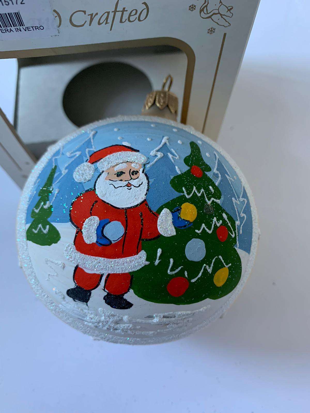 PALLINA CON ALBERO DI NATALE E BABBO DIPINTA A MANO 10 CM ADDOBBI NATALESCATOLA ESTERNA NON IN PERFETTE CONDIZIONI