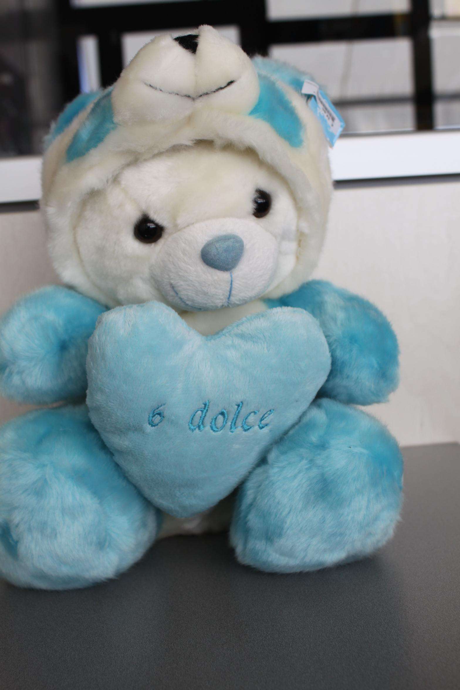 Peluche Orso bianco con cappuccio bianco azzurro cuore 30 cm Peticoco