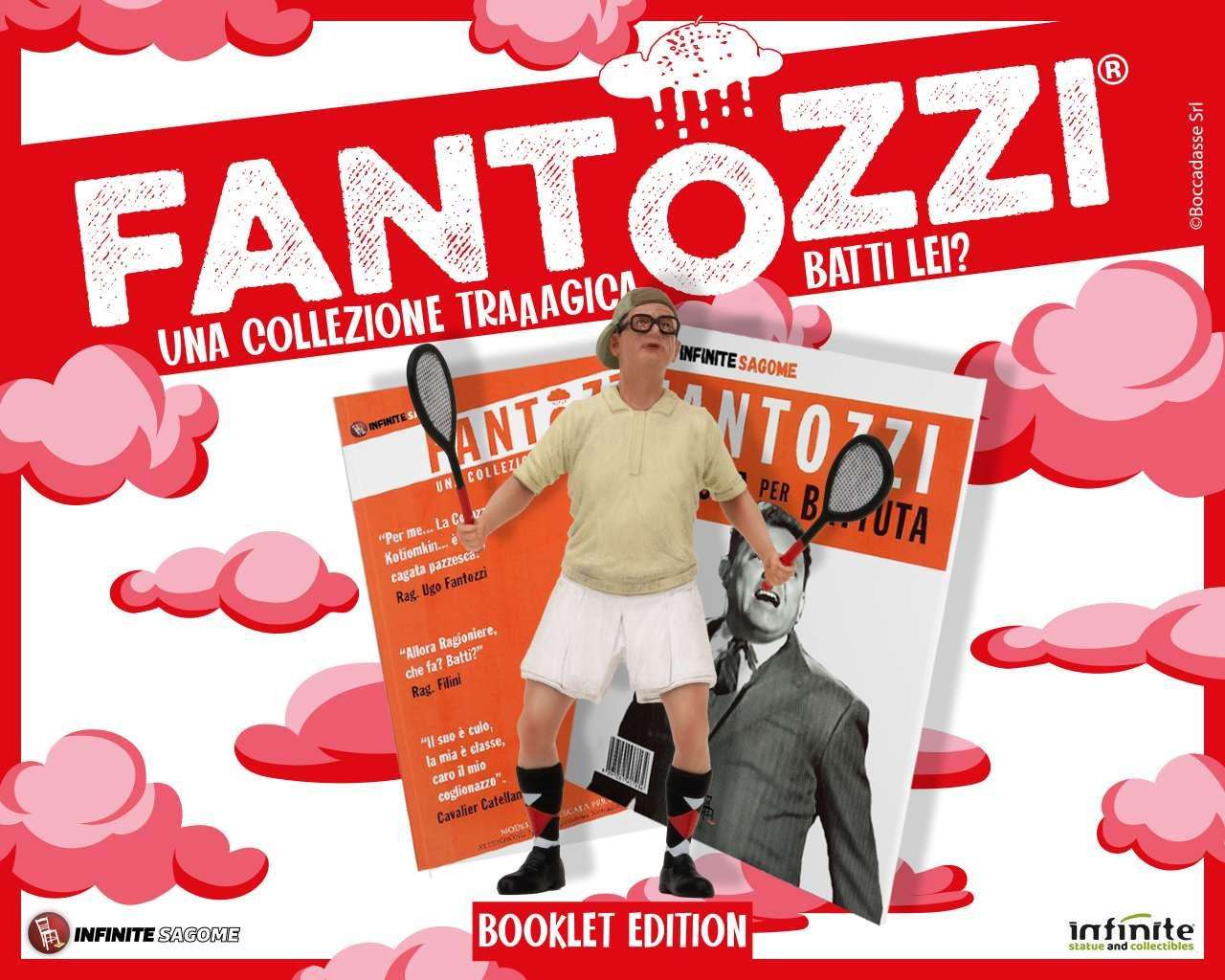 Da Infinite Statue & Collectibles, tornano disponibili in una nuova edizione con libretto realizzato da Sagoma Editore, i quattro personaggi della Serie 1 di Fantozzi mini pvc figure.FANTOZZI COME E’ UMANO LEI! – FANTOZZI AH! CONGIUNTIVO! – FANTOZZI …ALLA BERSAGLIERA – FILINI BATTI LEI? – sono le quattro mini figure che in questa nuova edizione esclusiva sono arricchite con un libretto che raccoglie tutte le battute famose e i momenti “tragicamente” memorabili del Rag. Ugo Fantozzi. Ogni personaggio è in blister singolo con libretto incluso all’interno.Tipologia : Mini FiguraGenere : CinemaProduttore : Infinite StatueAltezza in cm: 10x5x3Materiale : PvcPackaging : BlisterCodice a barre : 9791281907034