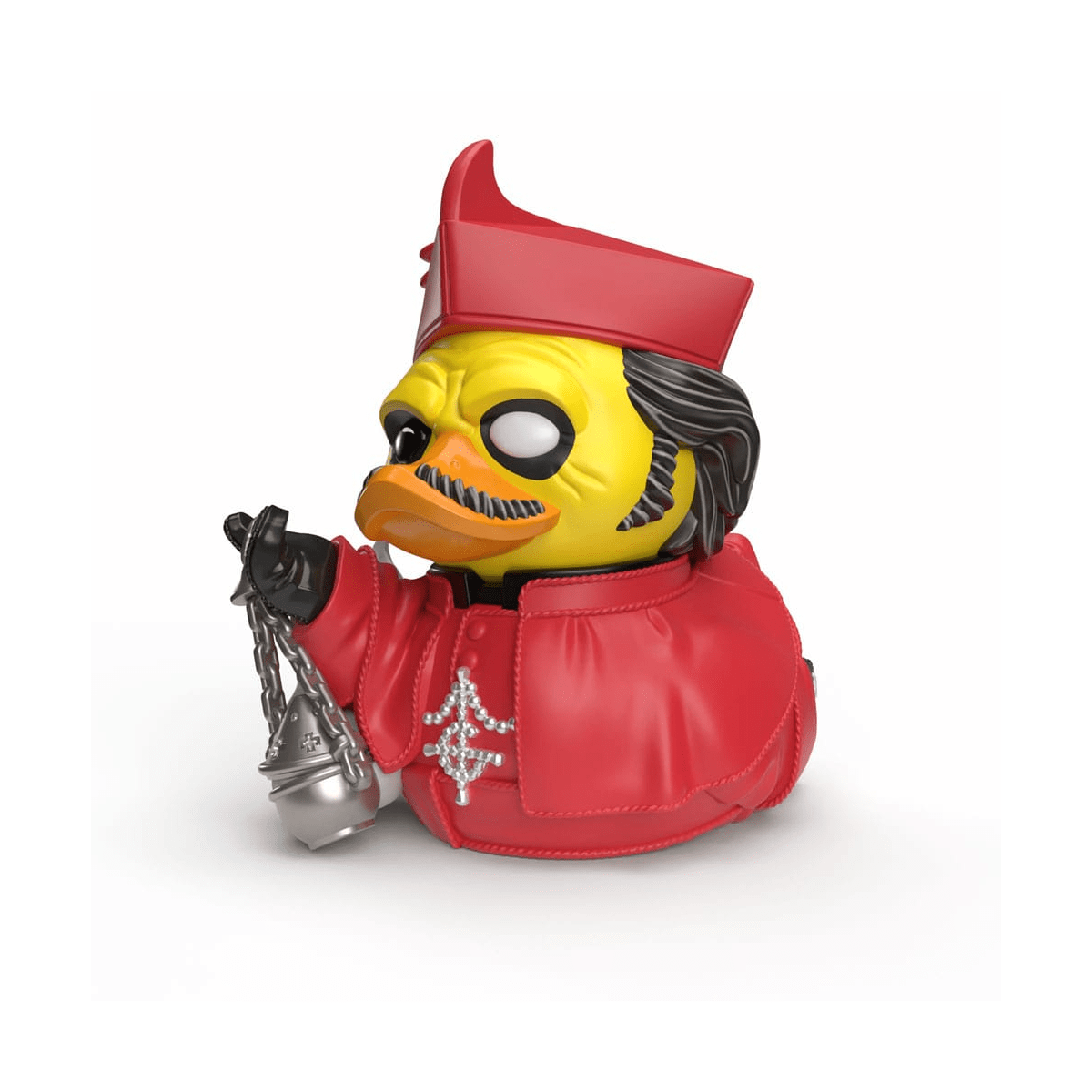 Questa anatra da collezione ufficiale reinterpreta in modo divertente e unico il celebre Cardinale dei Ghost, con tutti i dettagli del suo inconfondibile abito rosso e l’incensiere tra le mani. Realizzata in PVC di alta qualità, è perfetta per essere esposta grazie alla sua confezione a forma di vasca da bagno TUBBZ personalizzata.