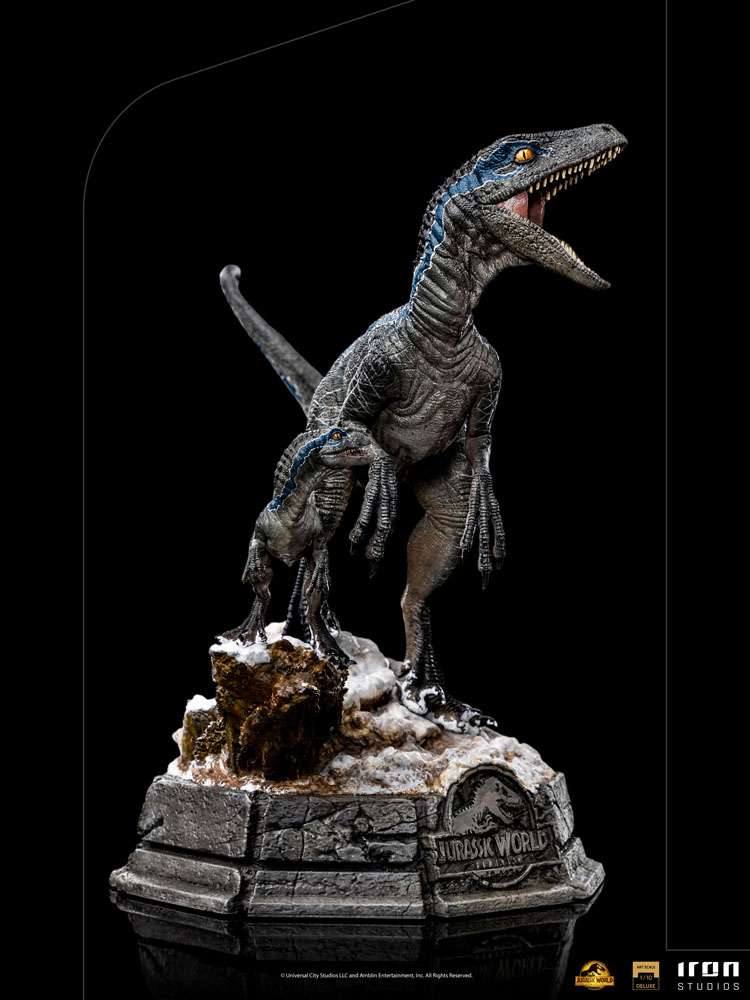 Unica sopravvissuta del suo branco, la femmina Velociraptor dalla pelle grigio-azzurra , contrassegnata da una caratteristica striscia blu che ne determinava il nome, trova una nuova compagnia accanto alla sua prole, una versione più giovane e più piccola di se stessa. Scoprendo un nuovo mondo e adattandosi a un nuovo terreno selvaggio con temperature più basse, il piccolo predatore osserva da vicino sua madre mentre ruggisce su un piedistallo di terra e tronchi coperti di neve. Con il logo del film sul davanti, scolpito in un murale di pietra che circonda il piedistallo, Iron Studios presenta con orgoglio un’altra uscita derivata dall’atteso climax della trilogia di Jurassic World, con la statua “Blue and Beta Deluxe – Jurassic World: Dominion – Art Scale 1 /10”, con il Velociraptor più amato dai fan e il suo piccolo bambino.