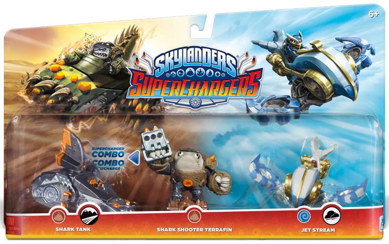 Triple pack contenente un personaggio e 2 veicoli per il videogioco Skylanders SuperChargers (venduto separatamente).